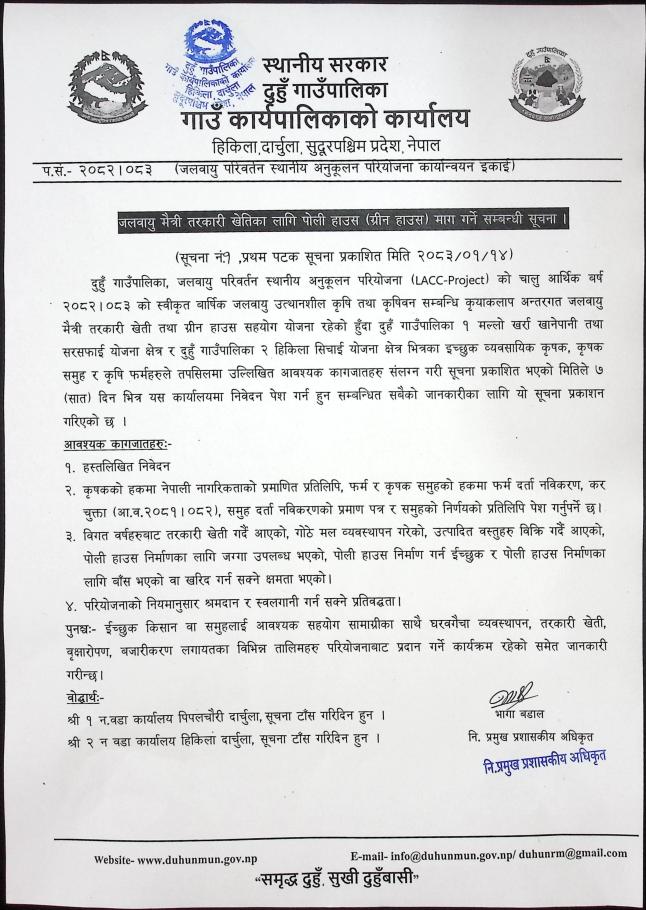 जलवायु मैत्री तरकारी खेतीका लागि पोली हाउस (ग्रिन हाउस) माग गर्ने सम्बन्धी सूचना ।